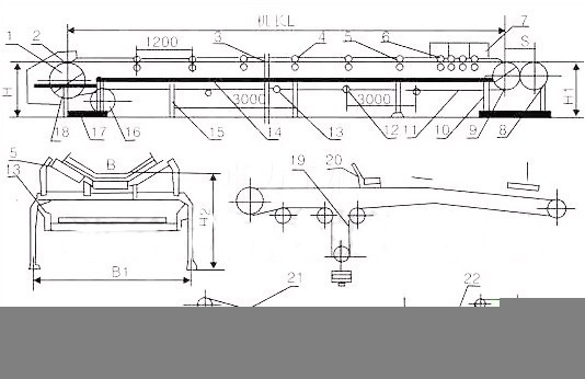 1、傳動滾筒;2、頭罩;3、輸送帶;4、槽型調(diào)心托輥;5、槽型托輥;6、緩沖托輥;7、導(dǎo)料槽;8、螺旋拉緊裝置;9、改向滾筒;10、尾架;11、空段清掃器;12、下平調(diào)心托輥;13、下托輥;14、中間架;15、中間支腿;16、改向滾筒;17、頭架;18、彈簧清掃器;19、垂直拉緊裝置;20、犁式卸料器;21、卸料車;22、車式拉緊裝置