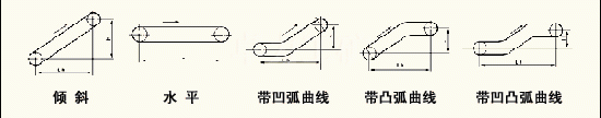 1.水平輸送。2.傾斜輸送機。3.帶凸弧曲形段輸送機。4.帶凹弧曲形段輸送機。5.帶凹弧及凸弧曲形段輸送機。